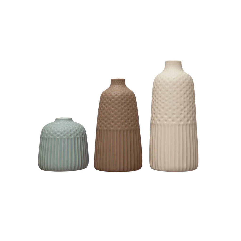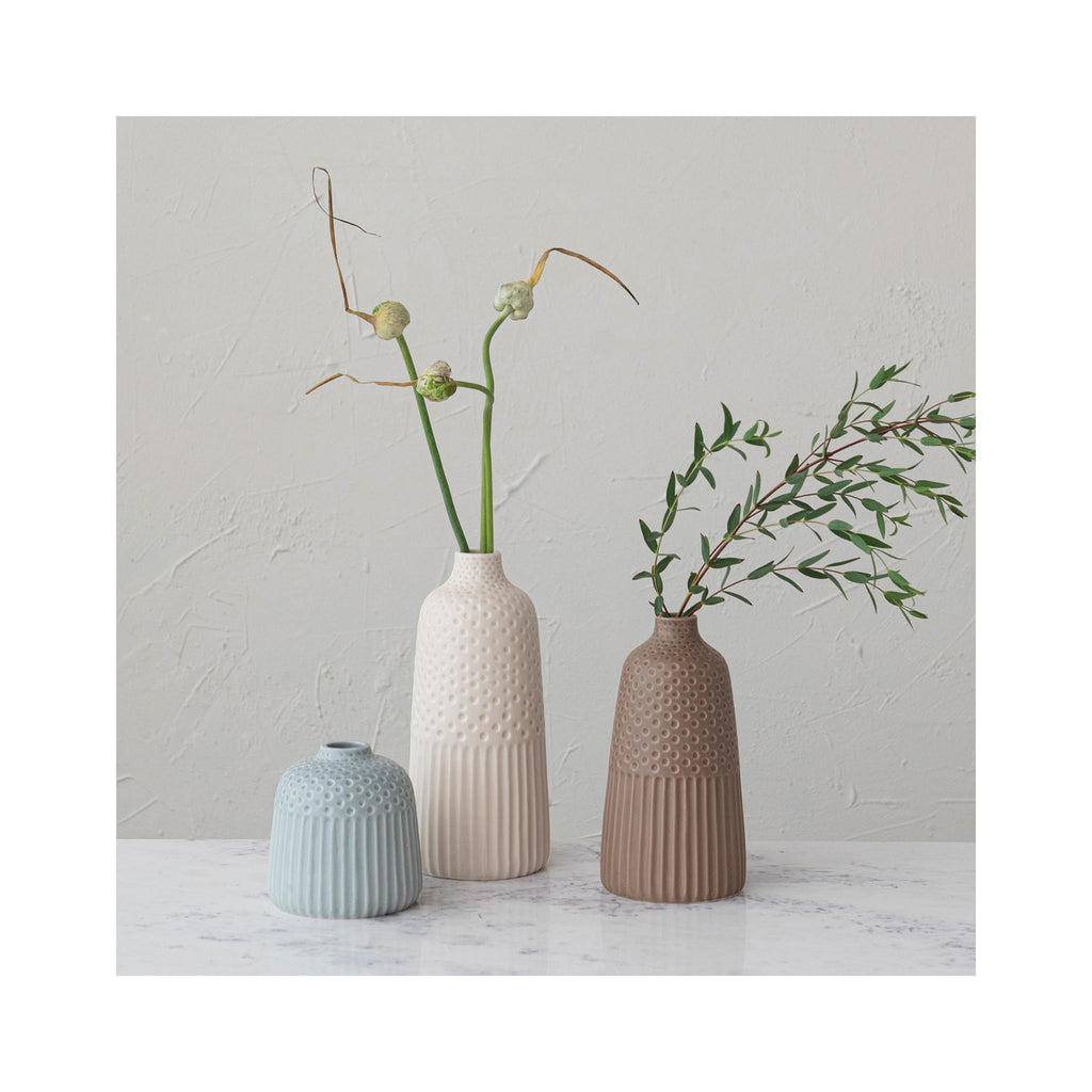 Looking for vases to create a striking vignette on a table or bookcase? These Debossed Glazed Stoneware Vases are sold individually and come in 3 colors/sizes. You can create a grouping by color or size. Each watertight vase features an embossed design with a different matte glaze. Fill with real or faux botanicals or simply leave unadorned. Choose by size/color: Small Blue, Medium Brown or Tall Off-White.