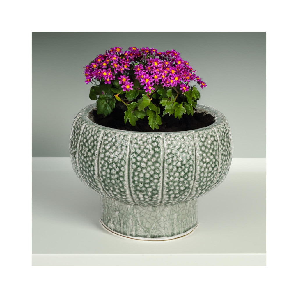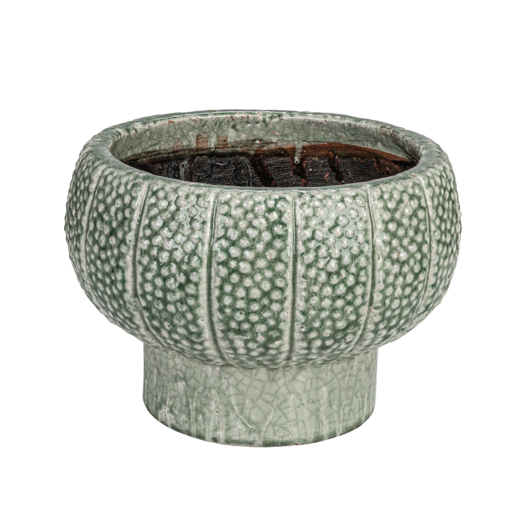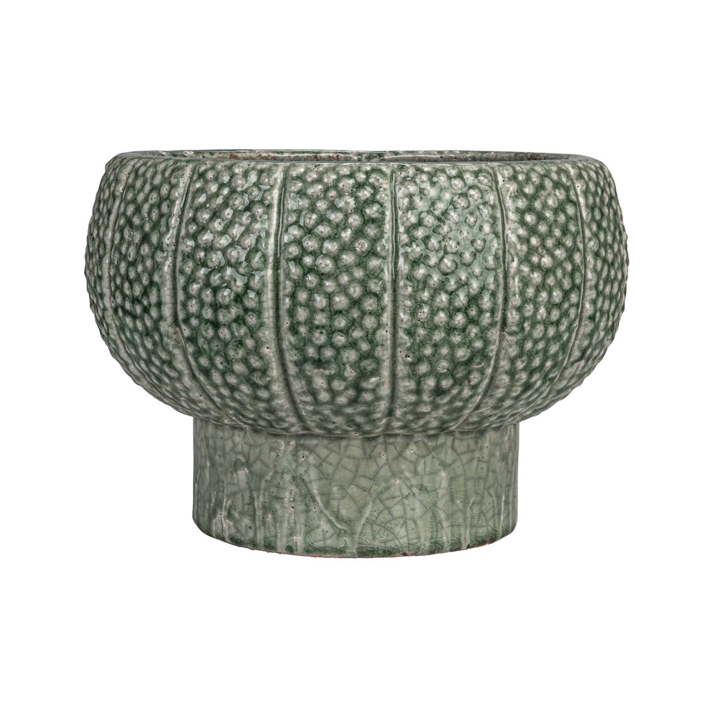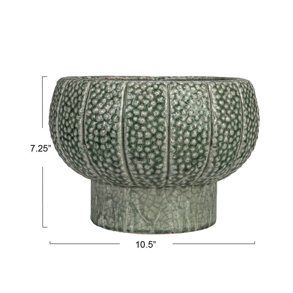Enhance your décor with this Embossed Terracotta Footed Vase/Planter featuring a distinctive dot pattern and crackle glaze in green. Crafted from premium terracotta, it stands on a footed base that adds dimension and texture. The crackle glaze finish offers a smooth, glossy surface that beautifully catches the light, while the green hue brings a refreshing vibrancy. Designed to hold a 10-inch pot, its round form includes a drainage hole, making it suitable for both indoor and outdoor use. Perfectly sized for tables, shelves, or windowsills, each piece varies slightly, ensuring a unique, stylish addition to your space.