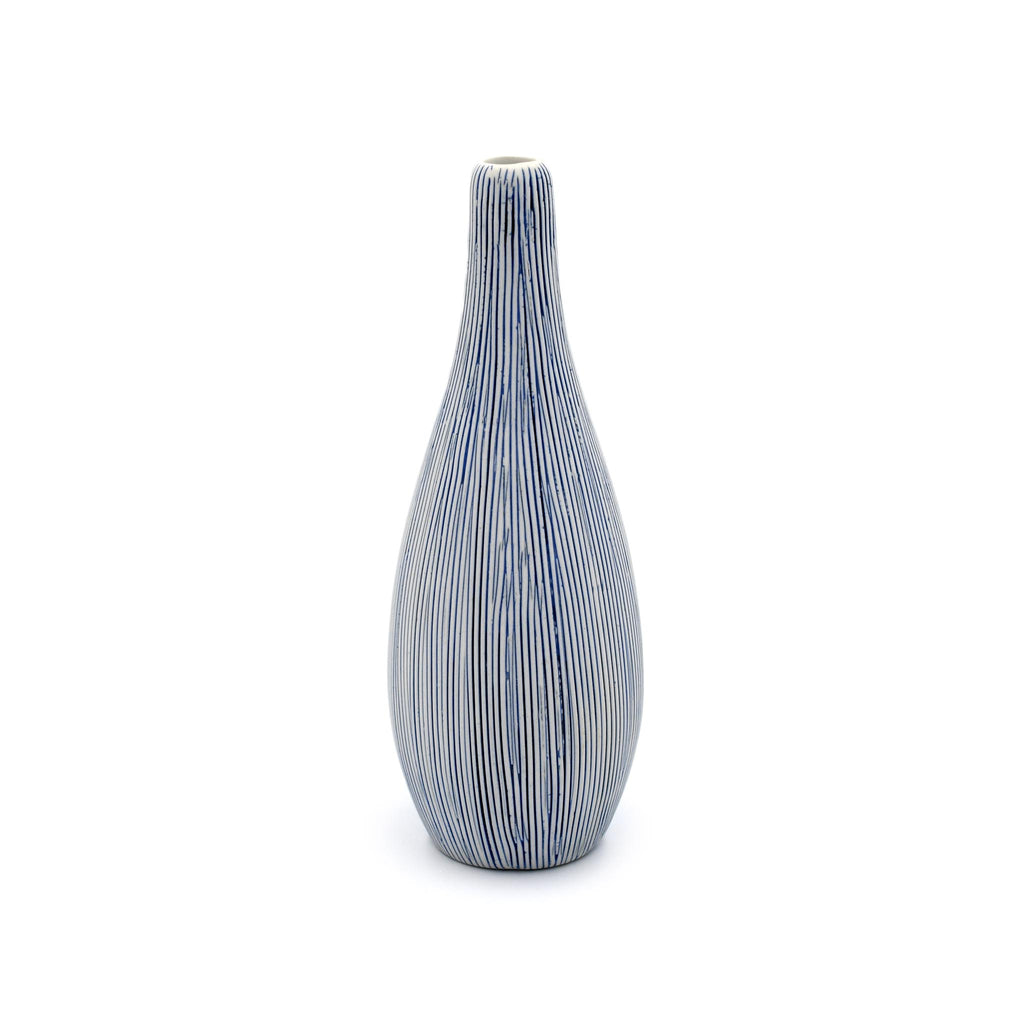 A modern sculptural vase created with high-quality white porcelain ceramic and applied textural matte finishes. This Modo Vase with it's blue lines is especially striking when displayed alone as a beautiful decoration for the home or as the perfect vase for a solo perfect bud. Each handmade piece will be unique and watertight.