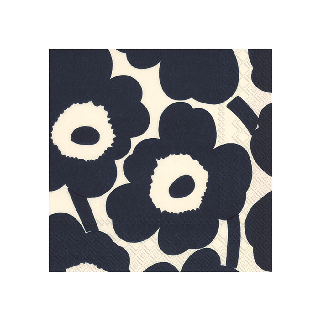 Designed by Marimekko, these luncheon napkins feature the iconic Unikko floral motif in dark indigo blue and natural. Perfect for any occasion. Set of 20 napkins.