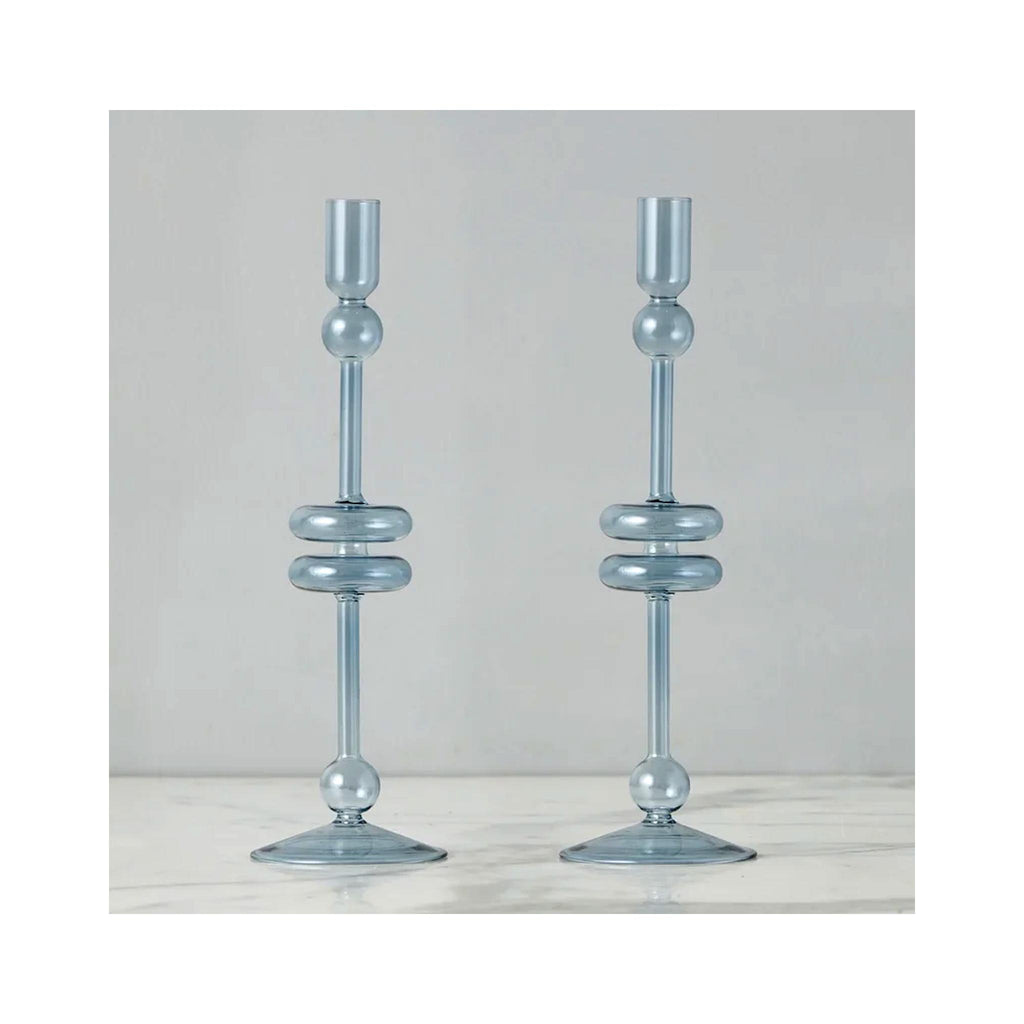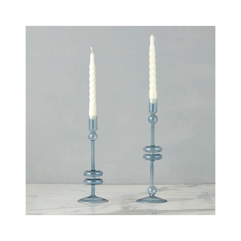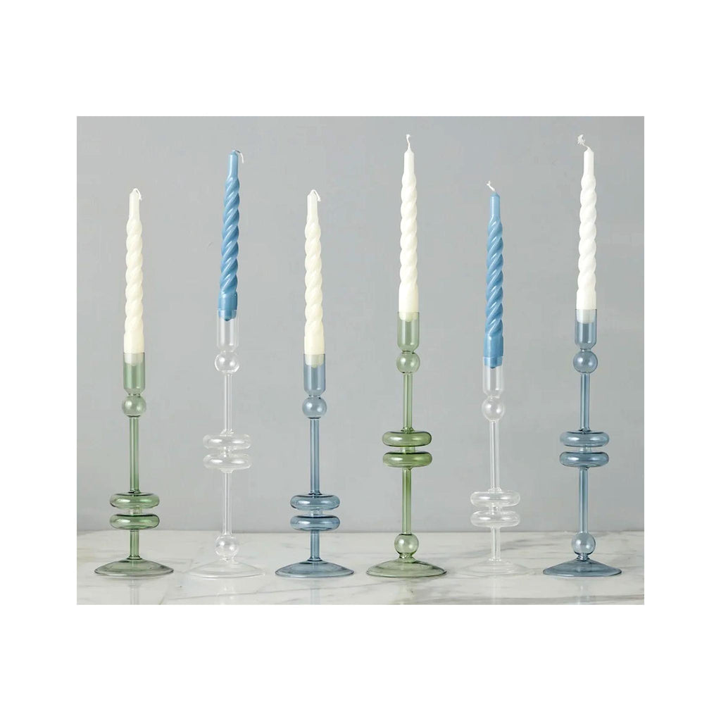 Elevate your home decor with a pair of elegant Glass Candlesticks. These expertly crafted taper candle holders add a touch of timeless elegance to any room. Available in two sizes (Medium or Large) and three colors (Clear, Denim or Sage), they are perfect for adding a pop of color to your dinner party or creating a statement throughout your home. Mix and match the sizes and colors to create a memorable tablescape. Set of 2.