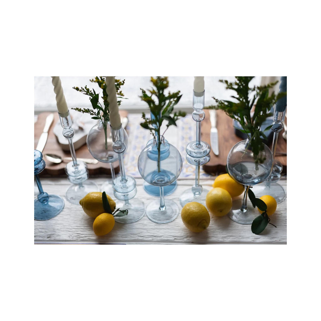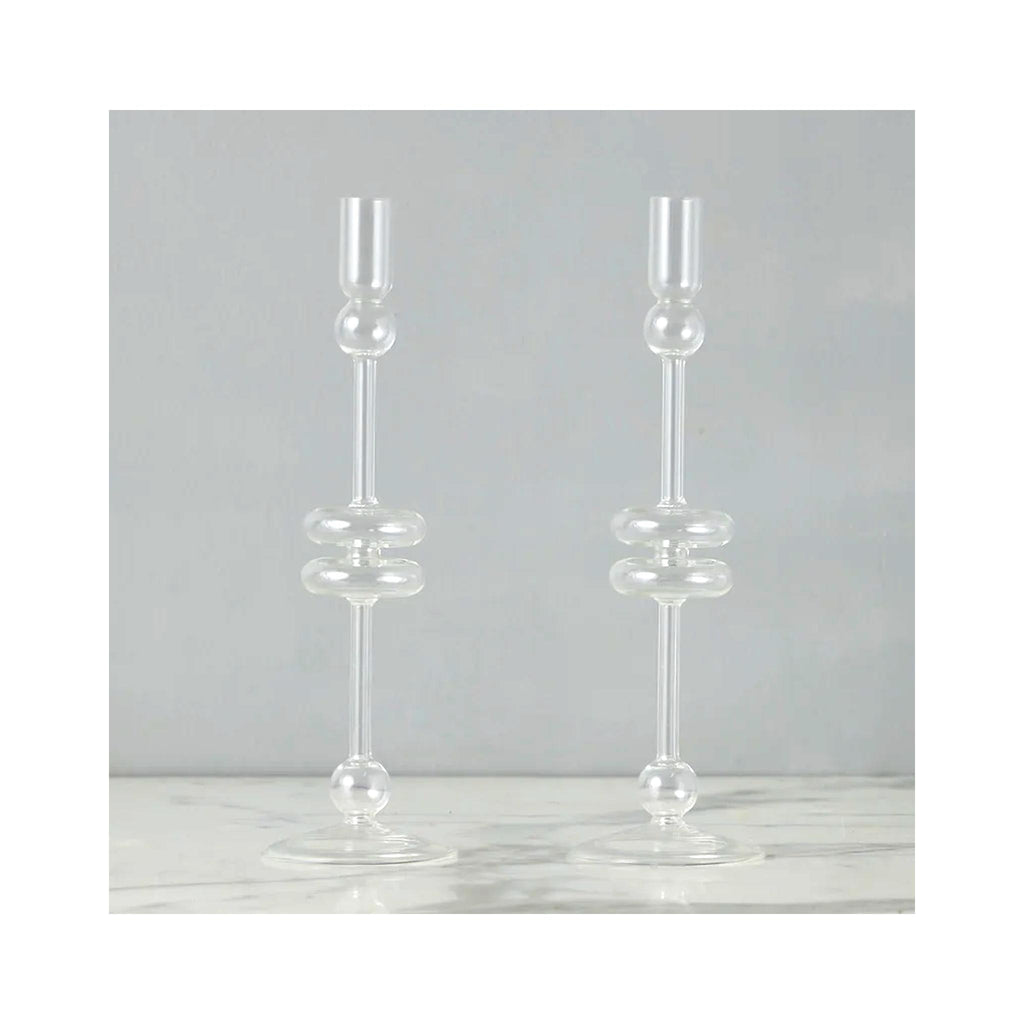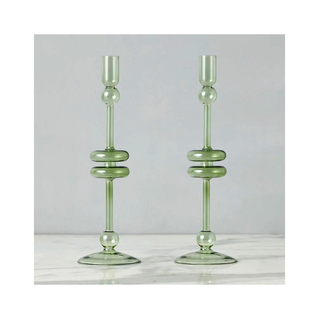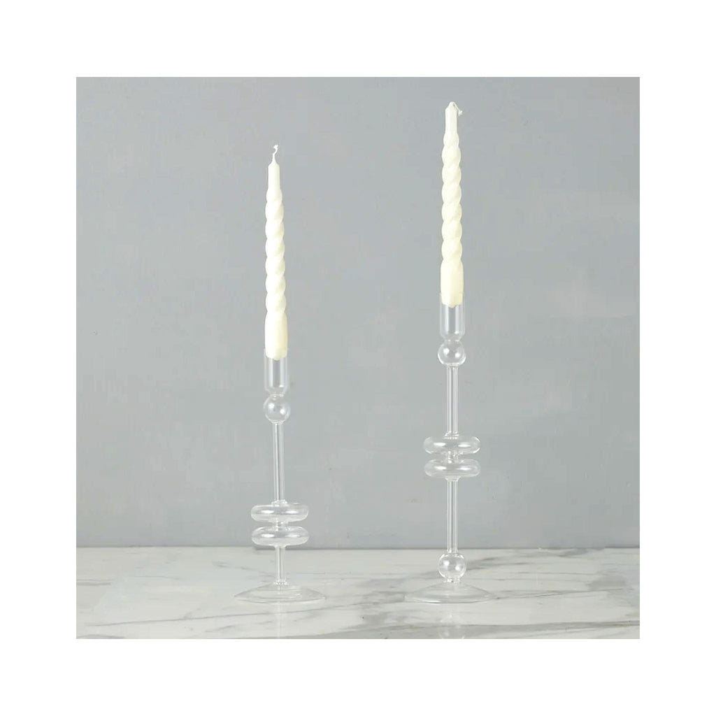 Elevate your home decor with a pair of elegant Glass Candlesticks. These expertly crafted taper candle holders add a touch of timeless elegance to any room. Available in two sizes (Medium or Large) and three colors (Clear, Denim or Sage), they are perfect for adding a pop of color to your dinner party or creating a statement throughout your home. Mix and match the sizes and colors to create a memorable tablescape. Set of 2.