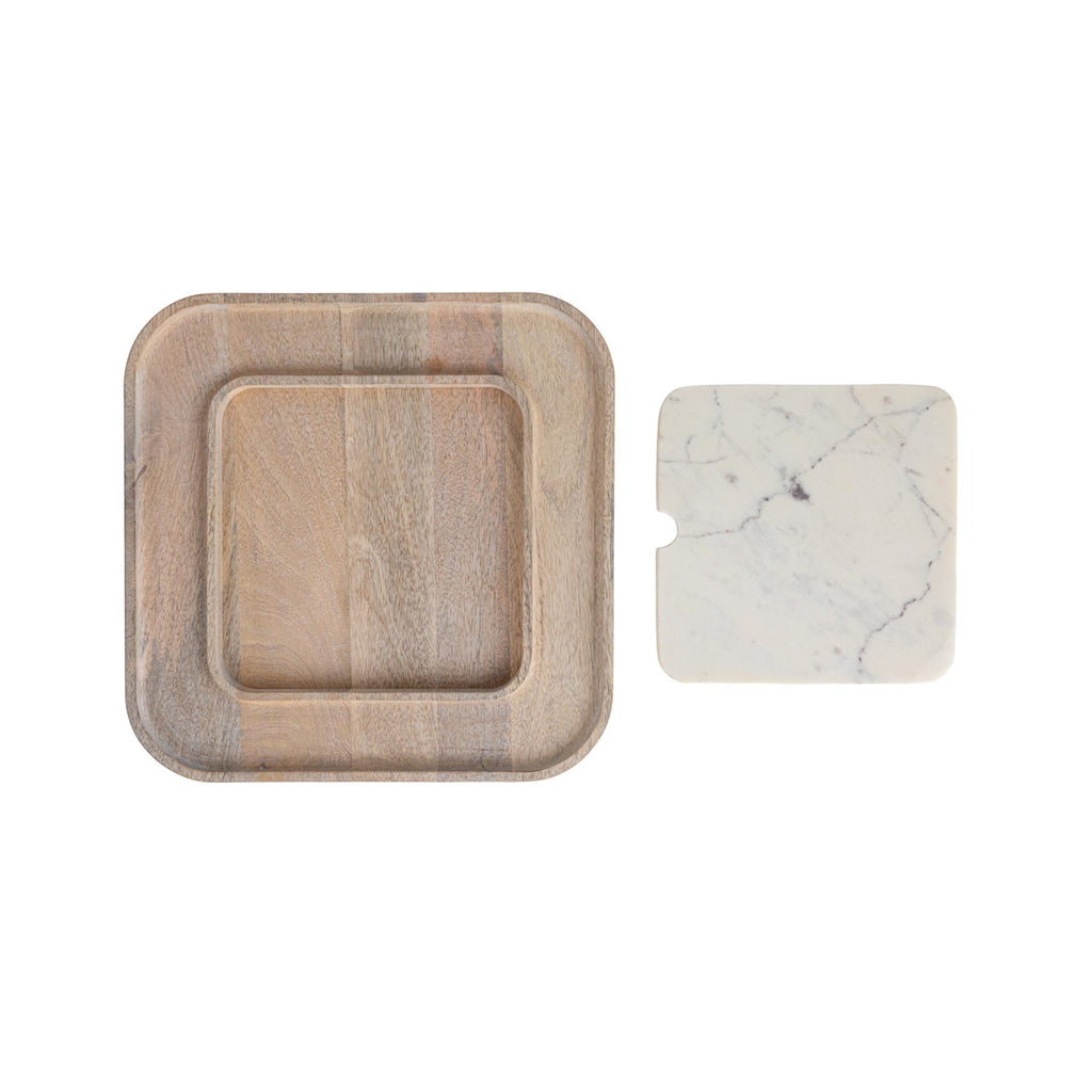 This Mango Wood & Marble Cheese Serving Set is a testament to timeless elegance and utility. The crisp white marble provides a perfect cutting surface, while the mango wood dish adds a touch of natural warmth, making it a standout piece in any kitchen. It's not just a cutting board; it's a statement of style. The mango wood board measures 13.5" and the removable cutting board measures 8.5", offering ample space for culinary creations.