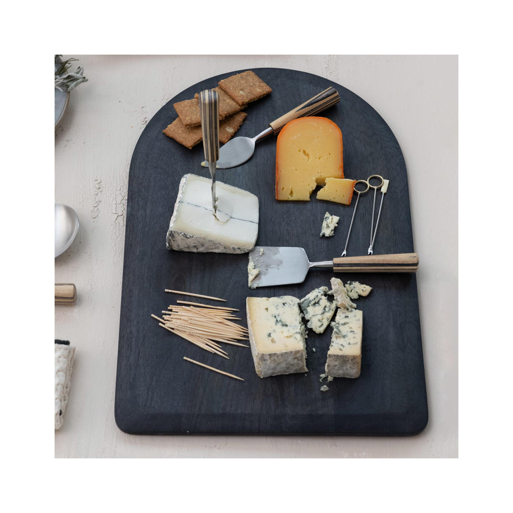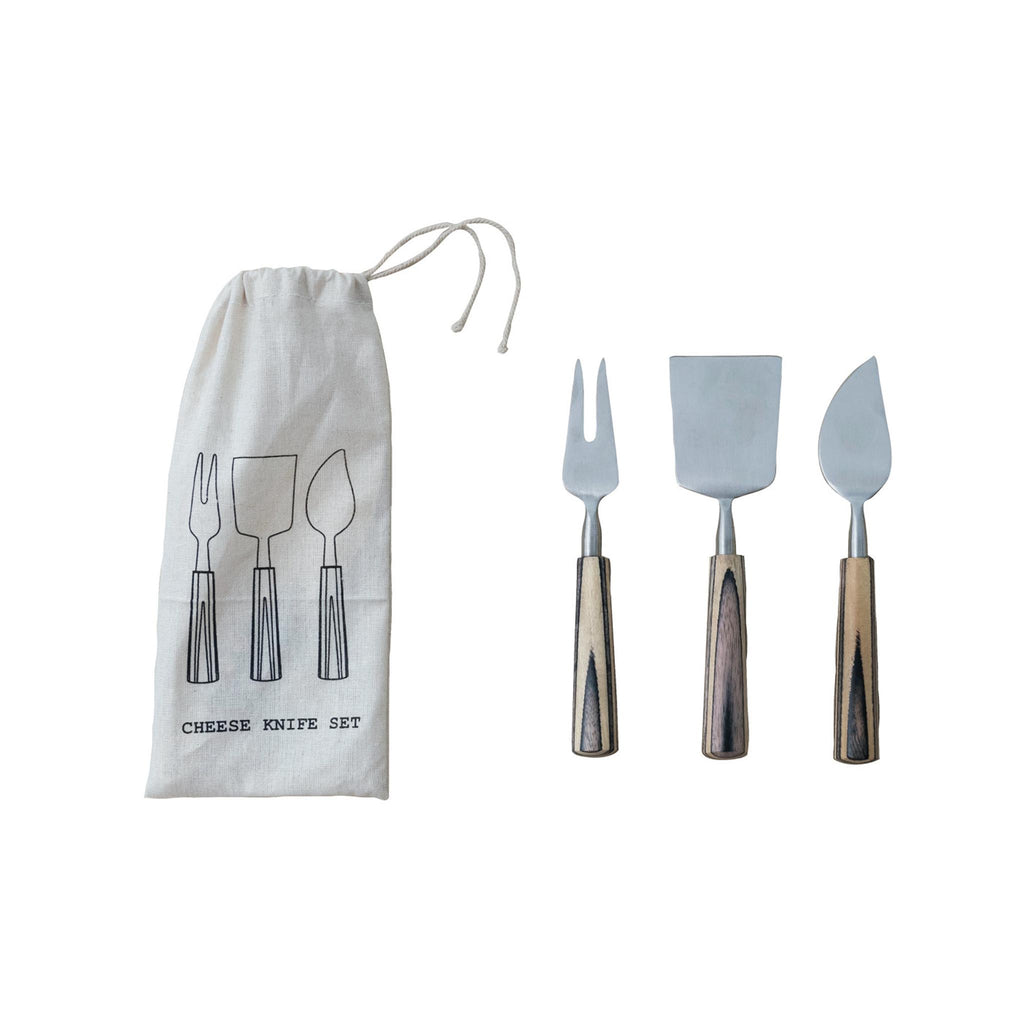 This 3-piece set of Stainless Steel and Mango Wood Cheese Servers, featuring handles with a natural and black design, includes a fork, spatula, and curved knife, all neatly packaged in a printed drawstring bag. Can be used for serving a variety of cheeses with ease and elegance. Made of high-quality stainless steel and durable mango wood for a blend of functionality and aesthetic. Perfect for entertaining guests or enjoying a cozy night in, these cheese servers are a stylish addition to any kitchen or dining table. The unique combination of materials adds a touch of sophistication to any cheese platter presentation. Set of 3.