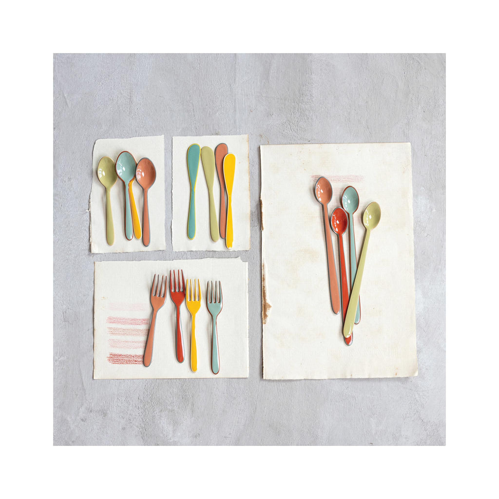 This set of four colorful enameled stainless steel canapé knives feature contrasting edges and is stylish and fun. Featuring a sleek and modern design, with sharp blades and long handles, they easily and beautifully cut and serve a variety of foods such as cheese, fruit, and cake. The perfect blend of form and function, these knives are a must-have for any host or hostess. Set of 4. Coordinating forks sold separately.