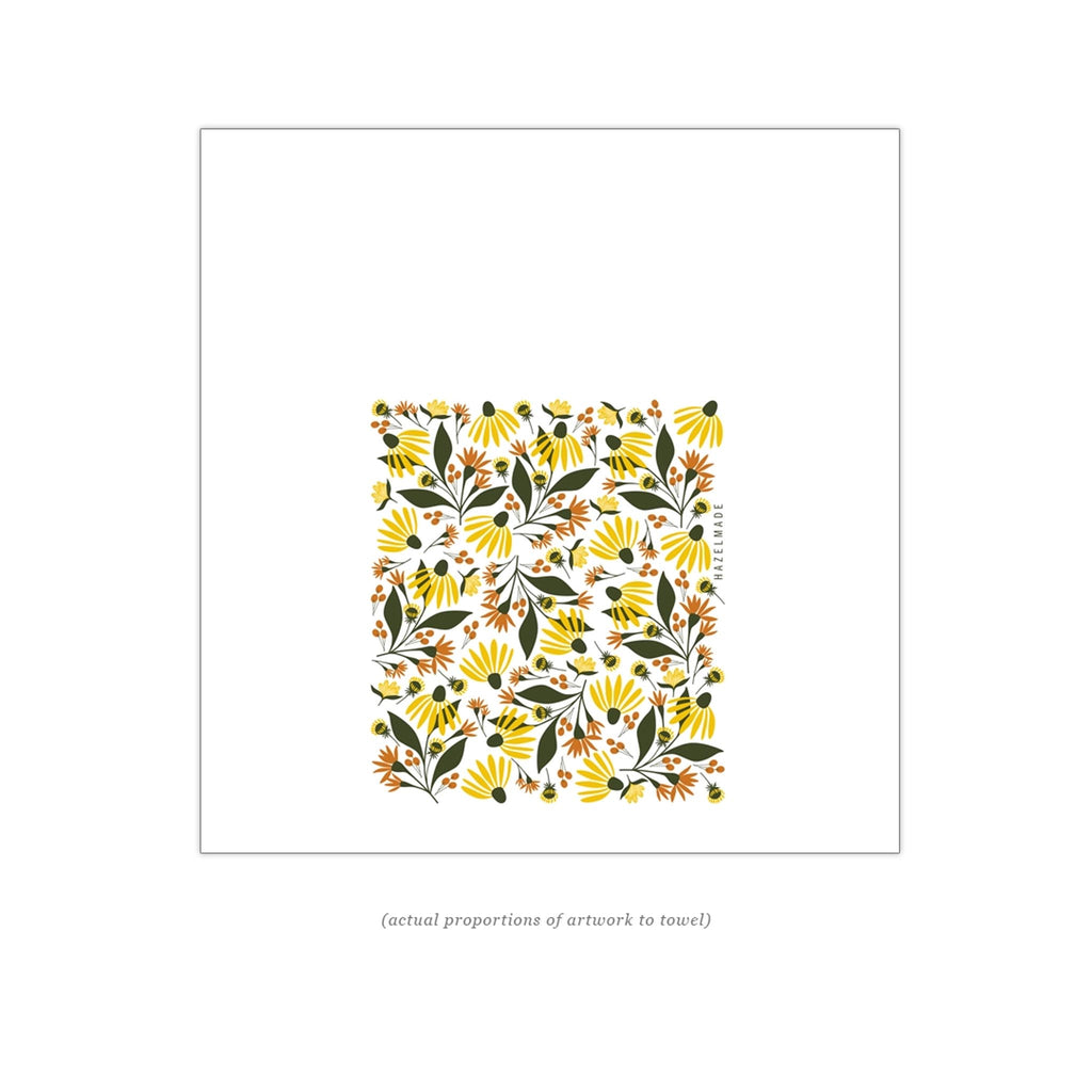 This tea towel features an original floral illustration with fall colors hand drawn by Hazelmade designer, Susan Hazel Rich. The piece was designed and finished by hand in the Hazelmade studio, located in Kent, Ohio. Susan always seeks exceptional quality in design as well as in the the materials she uses and wherever possible uses resource-conscious production. This towel is made with 100% cotton flour sack material and is printed with eco-friendly water based ink. The design covers a 14" x 16" section of the towel and comes folded with a kraft paper wrap label.