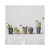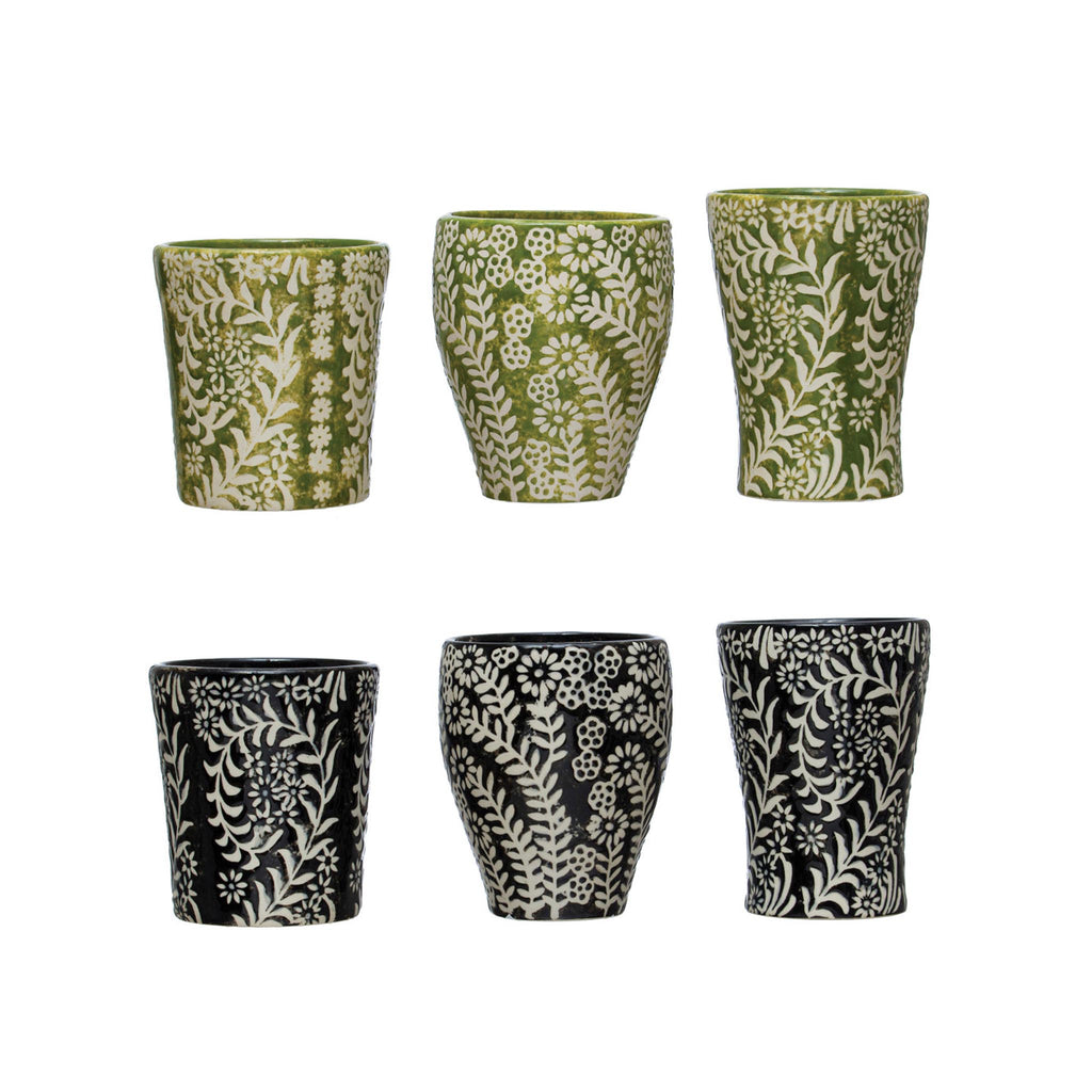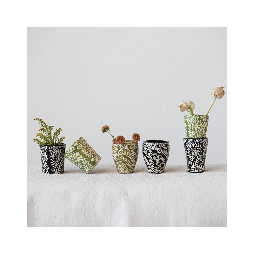 These stoneware cups, inspired by cottage aesthetics, include three classic shapes decorated with wax relief botanical patterns in two striking colors: Green or Black. Each piece presents subtle unique differences. Suitable for use as either a cup or a vase, offering versatile functionality. Select color and size. Each sold individually.